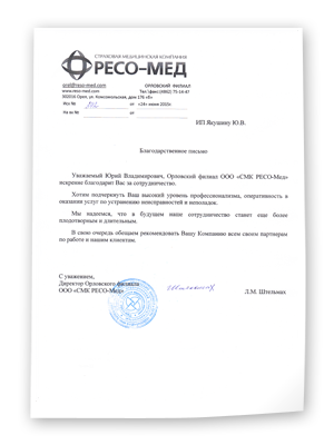 Уважаемый Юрий Владимирович, орловский филиал ООО «СМК РЕСО-Мед» искренне благодарит Вас за сотрудничество.